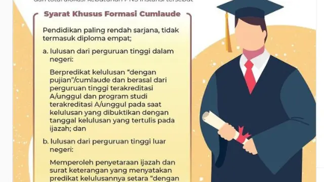 “Hai #SobatBKN lulusan sarjana dengan pujian atau cumlaude ….Ada info lho, formasi khusus CPNS yang diperuntukkan bagi kamu. Nah … bagi kalian yang tertarik untuk mendaftar CPNS melalui formasi khusus ini, yuk cek syaratnya,” tulis BKN, dikutip pada Kamis (24/6/2021).